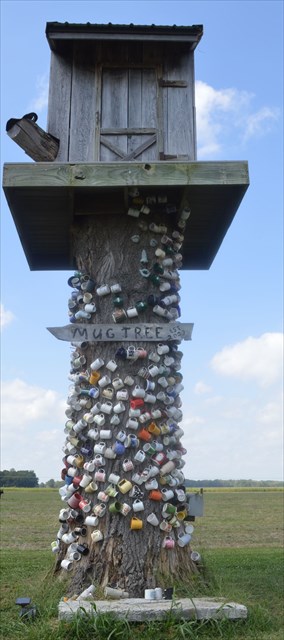 We were driving along looking for caches and discoverd this unique treasure on the outskirts of Yale, Illinois. Here is the story behind the mug tree: the owner began trimming branches of the tree but didn't want to get rid of the tree completely so he came up with the idea to hang mugs on display. Before long people from all over were stopping to take pictures of this unusual display. So, he came up with the mug swap. If you bring an unwantd coffee mug with you, you may hang it on the tree and take a mug that you like. He also placed an old mailbox beside the tree and placed a logbook inside. He encourages visitors to sign the book so he can enjoy reading who his visitors are and where they come from. This is a fun attraction so enjoy!