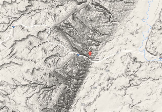As you face east you see I70 as it cuts through the Spotted Wolf Canyon and climbs to this location. From the ground you see on the valley floor you have climbed a 1000 feet and gone back millions of geological years in time to where you are now.