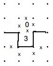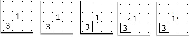 To solve the problems below you will have to work through the various possibilities for each square containing a number. A '1' can have 4 different line patterns around it, a '2' can have 6 different patterns, and a '3' can have 4 different pattern. The '1' and '3' situations are mirror images (in the '1' case one of the four side is filled in, whereas in the '3' case one of the four sides is not filled in). Identify the valid patterns for the numbers given. If a particular line segment is present in all valid patterns then fill it in. If a particular line segment must be empty in all valid patterns then put a cross there.