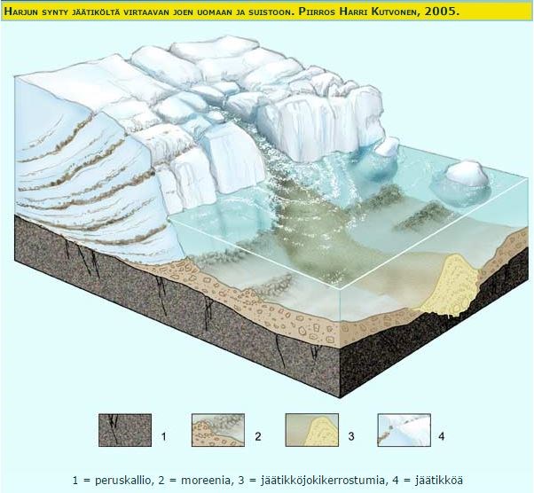 Mannerjään sulaessa muodostui suuria sulamisvesitunneleita eli jäätikköjokia jään sisään ja alle. Ne kuljettivat mukanaan maa-ainesta. Joki purkautui jään reunan eteen ja muodosti siihen suiston (deltan). Näistä suistoista syntyivät pitkittäisharjut. Jäätikköjokien virtaus puolestaan kulutti maaperään uomia.