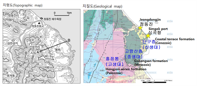You can observe Jeongdongjin Coastal terrace at the cache zone. The coastal terrace is 4 km long, 1 km wide and 75~85 meters above the sea. The surface of the terrace is almost flat but the coastal terrace cliff is formed with vertical rocks. You can observe a lot of flat gravels on the terrace. This is the evidence of coastal erosion and prove that these area was the sea in the past. There are 5 levels of coastal terrace. This means there were at least 5 times of intergracial period.