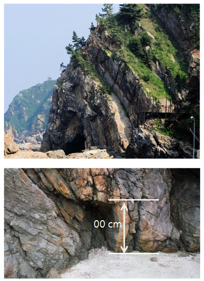 The upperleft picture is a sea cave formed on the cliff of coastal terrace and lowerleft one is a small sea cave in a big sea cave. Above the cave is the Gobangsan formation. A thick sediment formation was bended like a bow as a result of the diastrophism. You can observe the other examples of Gobangsan formation such as Fan shaped rock At Jeongdong port and Ladder shaped rock at Simgok port.