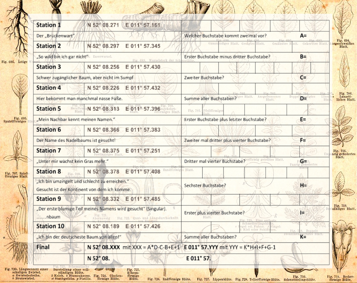 Druckt euch folgenden Laufzettel aus und ermittelt damit die gesuchten Lösungswörter an jeder Station. In welcher Reihenfolge ihr die Stationen ablauft, ist natürlich euch überlassen. Gesucht ist immer ein deutsches Wort (nicht die lateinische Bezeichnung). Die Koordinaten sind vielleicht nicht immer genau, gesucht wird jedoch immer ein Baum (auch wenn das gesuchte Wort nicht in allen Fällen der Name des Baums ist). Ein Baum kann vermutlich nur mithilfe des Internets und ein bisschen Raten ermittelt werden.