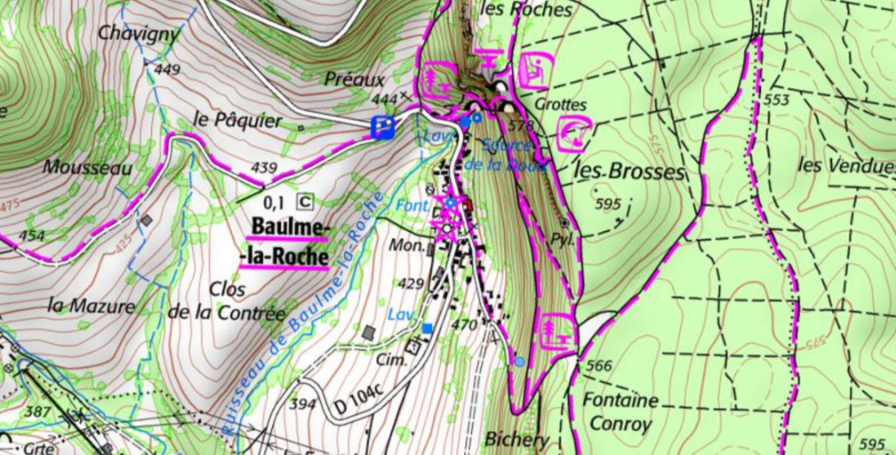 The village of Baulme la Roche, located thirty kilometers from Dijon by the National 5, has a number of interesting sights, most classified as an historic monument, with a center city very impressuve, as evidenced by the IGN map above below.
