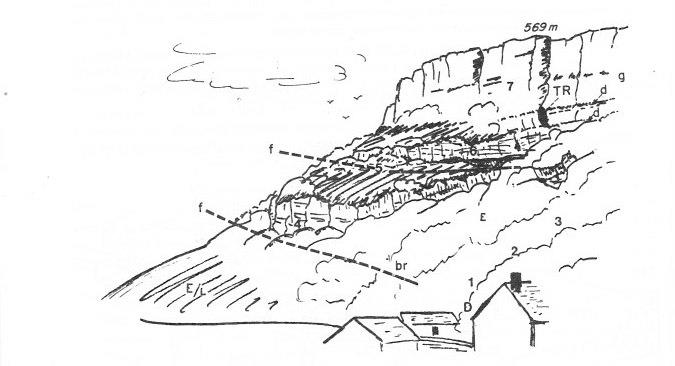 D douix / 1-2 Calcaire du Bajocien / 3 Marne / E Couverture d éboulis de Calcaire du Bajocien fragmenté par le gel. / br : surface de faille avec bréches dans le calcaire