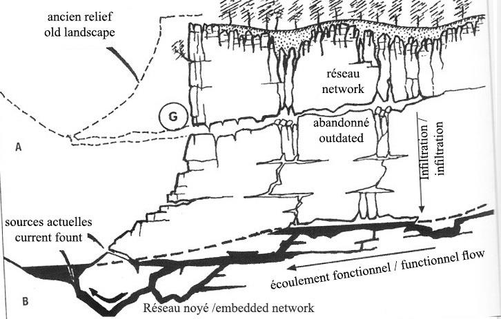 La vallée a été approfondie par les rivières ( de A jusqu à B )ce qui a provoqué la descente du reseau souterrain.