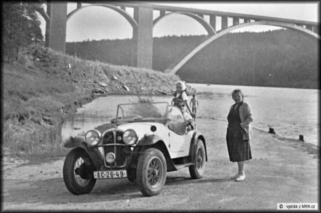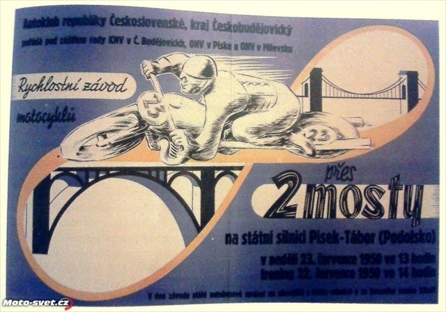 Do roku 1960 zde stály mosty oba. V letech 1950 - 1953 se zde jezdil motocyklový závod "Přes dva mosty". Volně z webu moto-svet: Sedmikilometrová trať ve tvaru osmičky ve svém středu překonávala řeku Vltavu po starém a novém mostě, které od sebe tehdy dělilo na výšku téměř 75 metrů! Po starém mostě se jelo po příčných dřevěných trámech jen pár metrů nad hladinou, oproti tomu na novém mostě ve výšce plných 80 metrů nad řekou. Přičteme-li k tomu zatáčkovitý úsek silnice po startu, plný betonových patníků, stromů a telegrafních sloupů, jednalo se o závod pro opravdové dobrodruhy. Při tehdejším velmi omezeném technickém zázemí pořadatelů je nutno přede všemi, kdo se těchto závodů zúčastnil, smeknout klobouk."