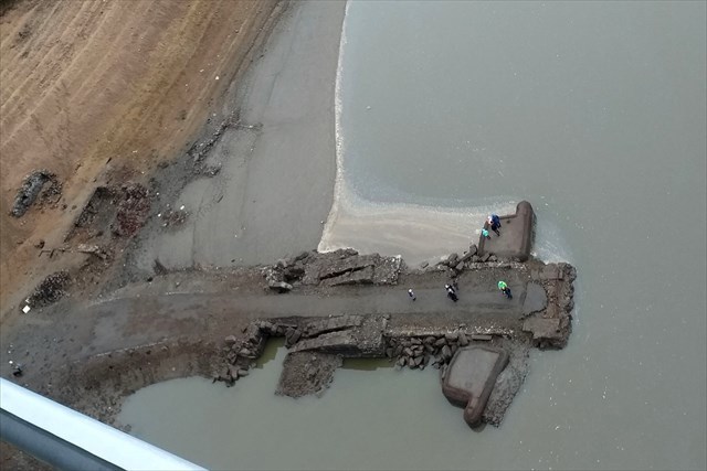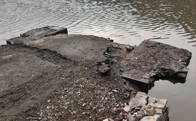 Z vody dokonce vystoupily i pravobřežní pilíře řetězového mostu a stropní desky bunkrů (fotku poskytl Matrix-1, fotil za stavu asi 335,3m).