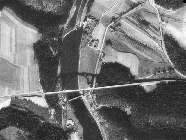 Na dalším snímku je právě napouštěna přehrada, řetězový most pryč a stará silnice zatápěna vodou Vltavy.