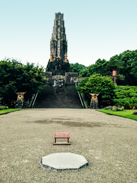 広辞苑によれば「世界をひとつの家とすること」という意味の「八紘一宇」の精神を体現するため、その土台となる1700個以上の礎石は陸軍の呼びかけで国内はもとより旧満州国、香港、台湾を含む中国全土に駐屯する多くの中国派遣軍部隊からも送られてきたもので、史跡の一部を切り出したかののようなレリーフが彫られた切り石も所々に見受けられます