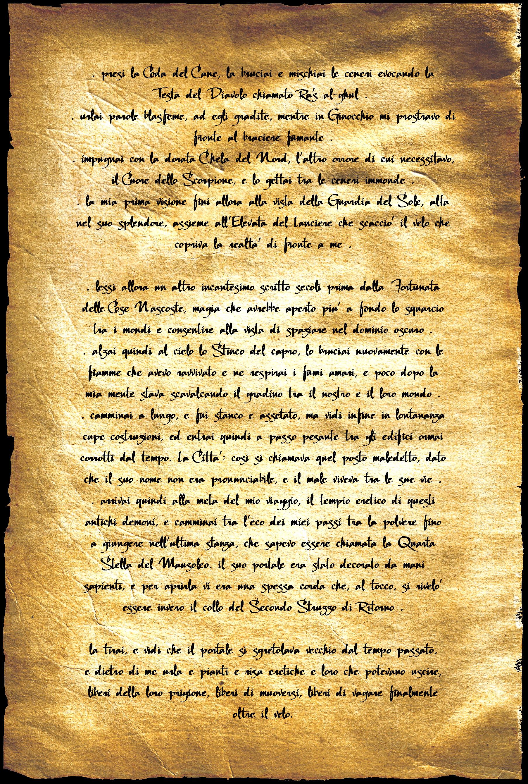 Un malditesta violentissimo mi picchiava in testa, e toccandomi la fronte mi accorsi di un grosso taglio, non ancora del tutto rimarginato. Guardandomi meglio vidi che ero chiazzato qua e là di sangue, come se fossi stato morso o graffiato, e nella mano non avevo più la Reliquia, bensì una pergamena bagnata ed ingiallita.