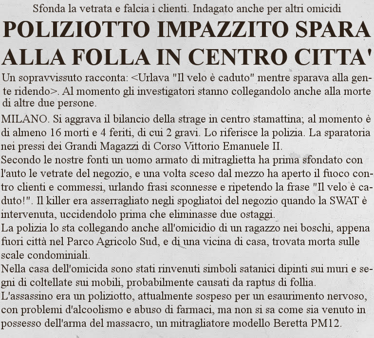 In quel momento mi resi conto che non riuscivo ad infilarmi il maglione nuovo perchè non avevo appoggiato sulla panchina nello spogliatoio la mia Beretta PM12; che cosa curiosa, non mi ero neanche accorto di averla presa stamattina.
