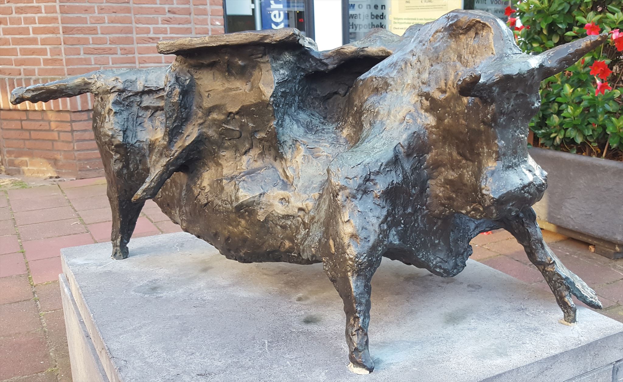 In “De ontvoering van Europa” zien we hoe de bekoorlijke en fragiel ogende dochter Europa door de als stier vermomde god Zeus wordt ontvoerd. Op zijn rug brengt hij haar naar Kreta waar zij zijn aardse vrouw zou worden en haar naam zou voortleven in het continent dat naar haar werd vernoemd: Europa. Net als in zijn schilderwerk, drukt de Almelose kunstenaar Hans Veneman zich in zijn beeldhouwwerken op een directe manier uit. De robuustheid, expressiviteit en de abstracte weergave van een figuratief motief wordt wel met COBRA en vooral Karel Appel in verband gebracht. Bron: uitinalmelo.