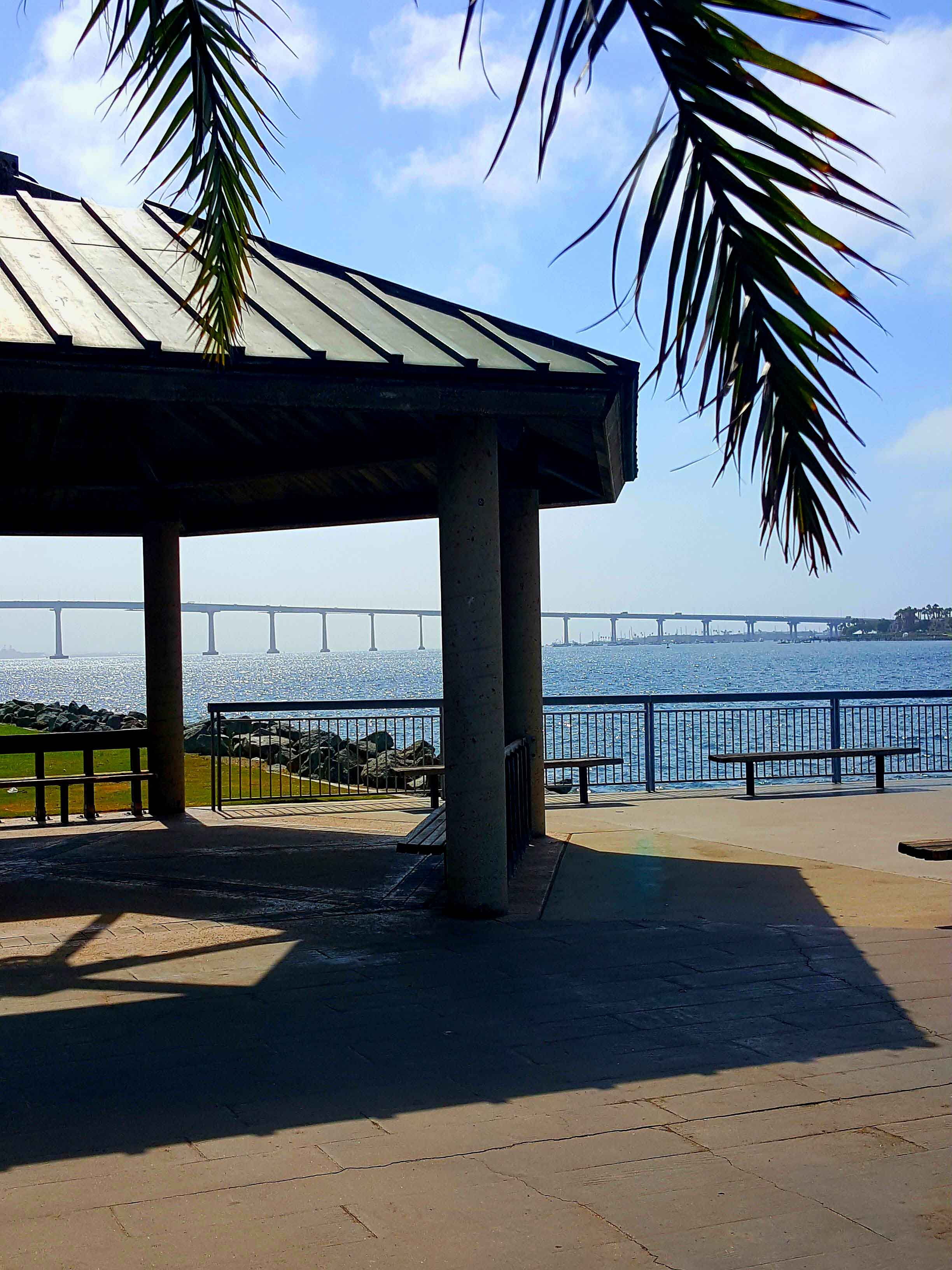 The park is very family friendly, you’ll find: picnic tables, shade trees, exercise stations, bike paths, public restrooms, a small fishing pier and a gazebo. From the gazebo and pier, you’ll be treated to breathtakingly beautiful views of the bay, Coronado Island, the majestic Coronado Bay Bridge, and both military and civilian ships and boats sailing by. We frequently see crabs on the rocks near the water, and if you sit on a bench on the pier you may be lucky enough to see a dolphin or sea lion. Hint, hint: if you stand against the rail you can enjoy the view and find a cache. The cache is small, so please bring your own writing instrument. You may be lucky and find the gazebo and pier empty when you arrive, but at other times it has quite a few visitors, so please be very stealthy, this tends to be a very high Muggle zone. Please be careful that you don't drop the container in the water.
