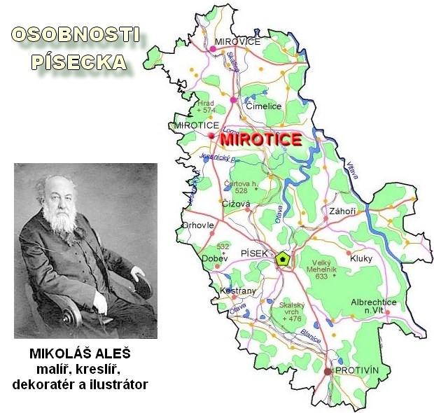 S putováním jsme začali ve městě Protivín, dále navštívili Písek, Heřmaň a Cerhonice. Další naše kroky povedou do Mirotic. Mirotice se nachází v jižních Čechách a první písemná zmínka pochází z roku 1254. Nejznámější osobností této obce je právě Mikoláš Aleš.