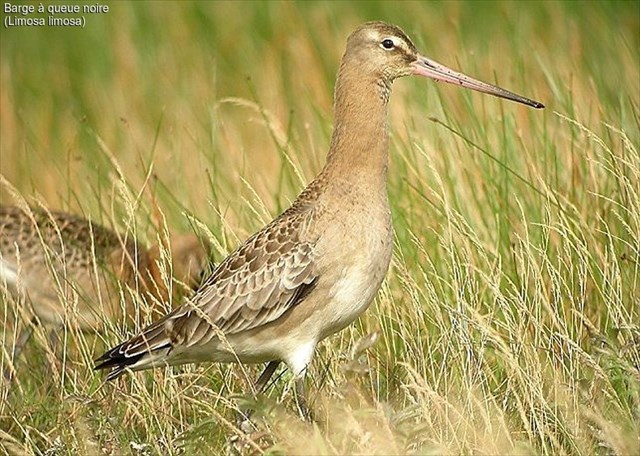 Chez la Barge à queue noire, le mâle est plus petit et plus coloré que la femelle, avec un bec légèrement plus court. En plumage nuptial, le sommet du crâne et la nuque sont roussâtres, striés de brun. Le sourcil, le menton et le dessous de l'oeil sont blancs. Une raie brune parcourt la face de l'oeil jusqu'au bec. Les joues, la face antérieure et les côtés du cou, la poitrine et le ventre sont d'une teinte rouille claire dorée. Le plumage de la poitrine est barré horizontalement de stries foncées et les flancs sont ornés d'écailles brunes. Le ventre et les sous-caudales sont blancs, contrastant avec le dos et les scapulaires d'un brun-marron brillant. Les couvertures alaires sont généralement grises, les grandes largement bordées Barge à queue noire de blanc, laissant apparaître en vol une tache claire nettement visible. Le croupion est blanc, ainsi que les sus-caudales. La queue est blanche à la base, noire dans sa partie terminale, le noir et le blanc étant nettement séparés. Le bec est très long, rose au jaunâtre à la base, corne à la pointe, se relevant très légèrement dans le dernier tiers. En plumage hivernal, sourcils, menton, bas de la poitrine et ventre deviennent d'un blanc pur. La tête, le cou et les flancs prennent une teinte gris clair uniforme, parfois légèrement soulignée de roux. Tout le dessus est gris foncé avec la bordure des plumes plus claire. Quelques taches discrètes continuent à marquer le dessus de la tête, les côtés du cou et les flancs. Le miroir de l'aile s'obscurcit. Seuls le croupion et la queue demeurent inchangés. En Barge à queue noire toutes saisons, l'intérieur des ailes est blanc, avec de fines taches sombres sur la partie supérieure.
