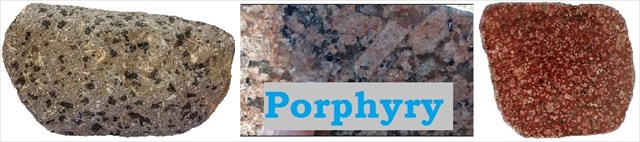 The term 'porphyry' describes a specific texture found in igneous rocks, where they contain larger crystals of certain minerals (especially feldspar or quartz), these being surrounded by a composite of minerals that have a much smaller sized crystal. The larger crystals are called 'phenocrysts' or 'sprinkle grains'. Porphyritic structures are characteristic of lavas and the igneous rocks found in dykes and sills. The phenocrysts are separated by the slower cooling of magma at depth, while the smaller-sized matrix is caused by a more rapid cooling after the magma is squeezed into a crack in the Earth's crust and/or it has reached the Earth's surface.