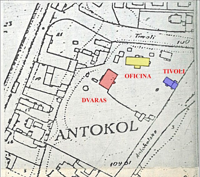 [EN]. The manor of Antakalnis was founded at the end of 18th century. Summer residence was built with a large (almost 3 ha) regularly planned park. At that time manor belonged to the monastery of St. Peter and Paul. At 1782 Bishop Dovydas Pilchovskis was given to live and use the residence. In the beginning of 19th century there was a famous Tivoli tavern. Later the manor belonged to a countess Tyman and 1874 buildings were purchased by officer Boleslovas Lastauskas. In 1899 residence came to the hands of engineer Stanislavas Blaževičius, who renewed buildings with wooden entryways and redocarated interiors. Later on the building became a few flat apartment and Tivoli tavern transformed to local restaurant „Trys pušelės“.