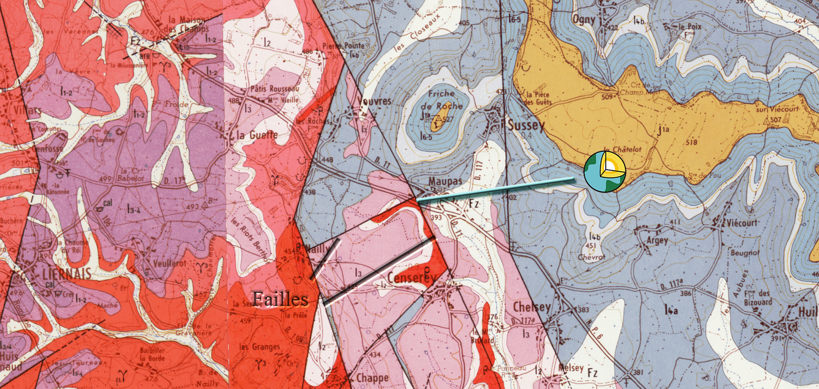Although it sagisse is not the main flaw that highlights the uplift of the Morvan, but one of many transverse faults which shifts the terrain, this flaw can observe exchanges between red rhyolite rock which is a eruptive and bluish gray limestone Sinemurian rich in Gryphées; in other words the sedimentary formations and the base.