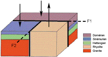 -> F2 est la faille transverse qui met en contact la rhyolite et les calcaires du Sinémurien.