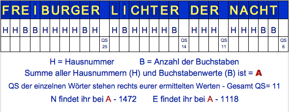 Auf dem Weg von Station 1 in der Rempartstrasse, über Humboldtstrasse, Martinsgässle, Kaiser-Joseph-Strasse, Löwenstrasse, Kaiser-Joseph-Strasse, Münsterplatz, Kaufhausgässle, Schusterstrasse, Herrenstrasse, Oberlinden, Geberau bis zu Station 24 auf dem Augustinerplatz sollt ihr die Häuser mit den Leuchtreklamen finden, aus denen die Buchstaben für die „Freiburger Lichter der Nacht“ stammen. Das können einzelne Leuchtbuchstaben oder aber auch beleuchtete Schilder mit nicht selbstleuchtenden Buchstaben sein.