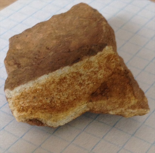 -Breche den Sandstein auf und beschreibe die Körnchengröße und Farbe.