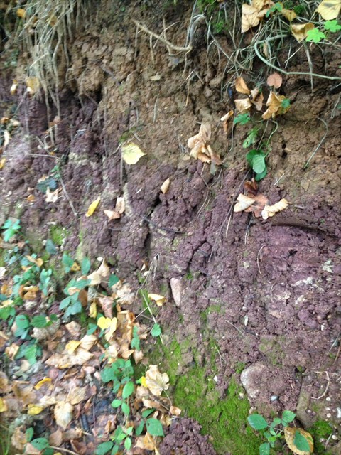 1. Bei den oben angegebenen Koordinaten siehst du am kleinen Hang die rötliche Erdschicht (siehe Bild). Wie kann es zu dieser Färbung gekommen sein?