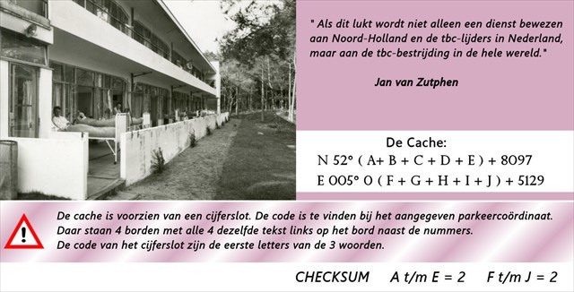 Parkeren op aangegeven parkeercoördinaat, tevens het vraagteken De cache is geplaatst met toestemming van Landgoed Zonnestraal