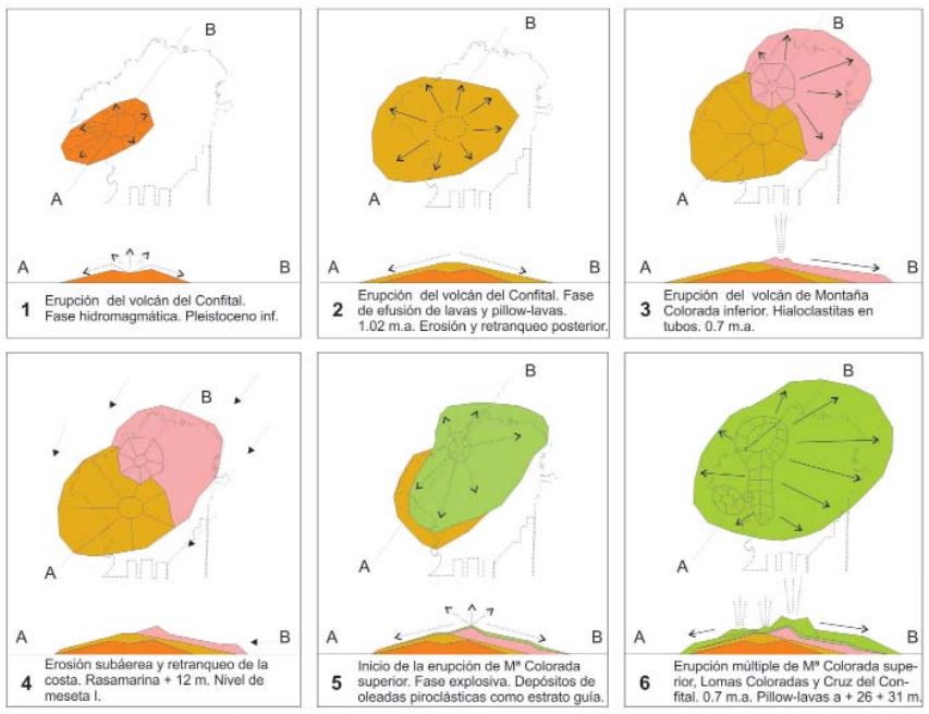 desmantelados, cierran la fase subáerea juvenil y generan un islote de dimensiones ya similares a las actuales. En su actividad eruptiva, si bien predominan los mecanismos efusivos, de poca explosividad, aún se intercalan erupciones hidromagmáticas de alta explosividad, generando depósitos piroclásticos de color rojizo que sirven de capas guías para la correlación estratigráfica.