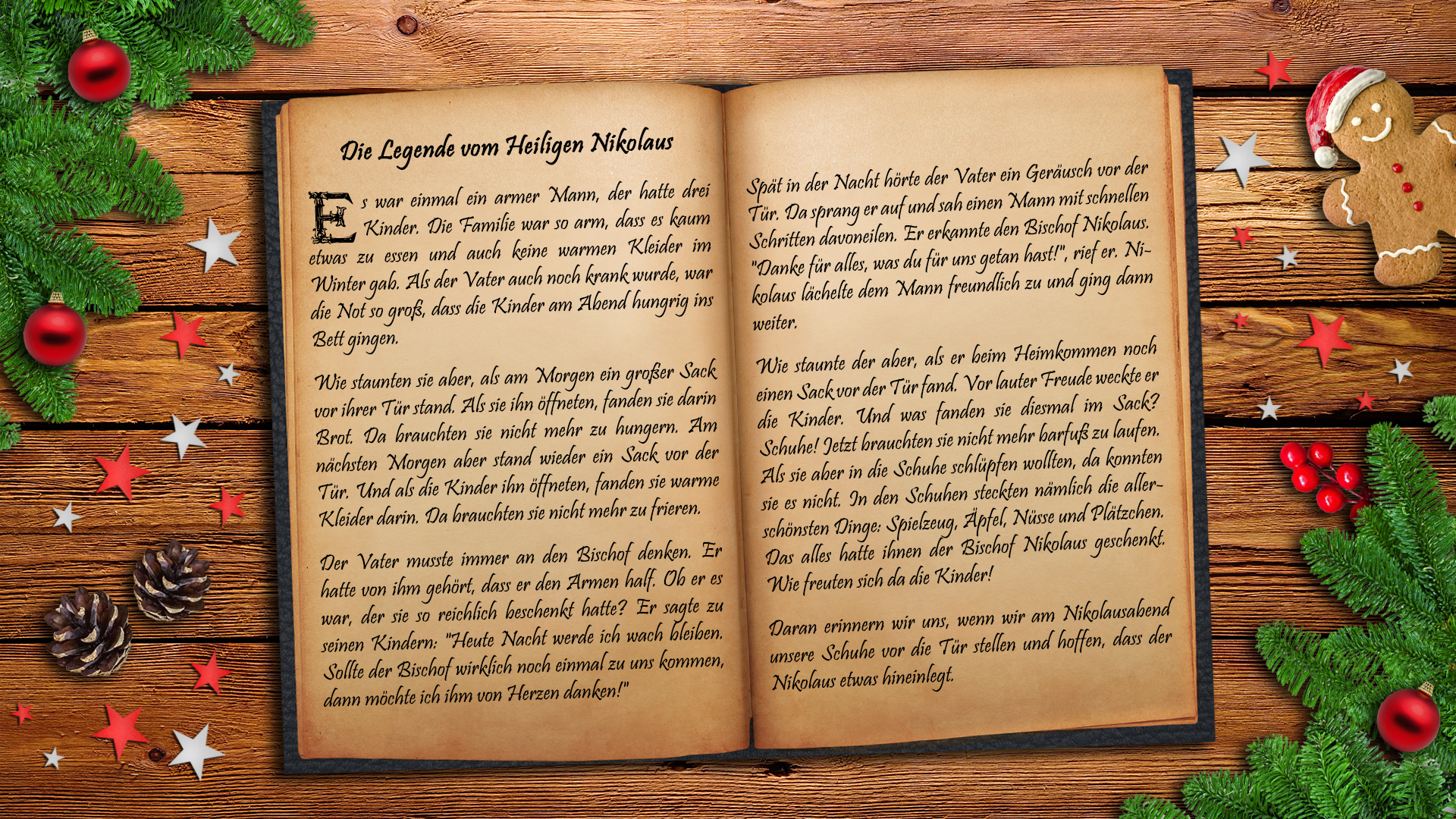 Der Vater musste immer an den Bischof denken. Er hatte von ihm gehört, dass er den Armen half. Ob er es war, der sie so reichlich beschenkt hatte? Er sagte zu seinen Kindern: "Heute Nacht werde ich wach bleiben. Sollte der Bischof wirklich noch einmal zu uns kommen, dann möchte ich ihm von Herzen danken!"