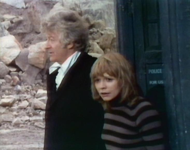 Kaolinite was formed by the hydrothermal alteration of granite. The granite around St Austell formed between 285-270 million years ago during the Early Permian Period, but shortly afterwards, alteration commenced with the intrusion of quartz and tourmaline veins and in some areas, this brought metal mineralisation too. Originally composed of quartz, feldspar and mica, it is the feldspars in the granite that have been altered (mostly in the past 200-25 million years) to produce the China Clay. The quartz remains relatively unaltered, as does the mica (other than losing some of the iron that it contained and/or recrystallising as a finer-grained form). Although some is sold as aggregate, the quartz and mica are waste products in the China Clay industry. It is said that the ratio of profitable China Clay to waste is 1:9. That means for every 1 tonne of China Clay produced, 9 tonnes of waste material has to be moved and dealt with as well. Historically, this waste has been piled-up into tall conical spoil tips known as sky tips and the mix of deep pits and mounds has given the area a characteristic ‘lunar’ landscape sometimes known as the White Alps of St Austell. For this reason, it may interest Doctor Who fans to know that Baal Pit was used as a film set for the series in 1971. It was supposedly the surface of planet Uxarieus in the episode called Colony in Space that featured Jon Pertwee as the Doctor. Some pictures from the episode can be seen below: