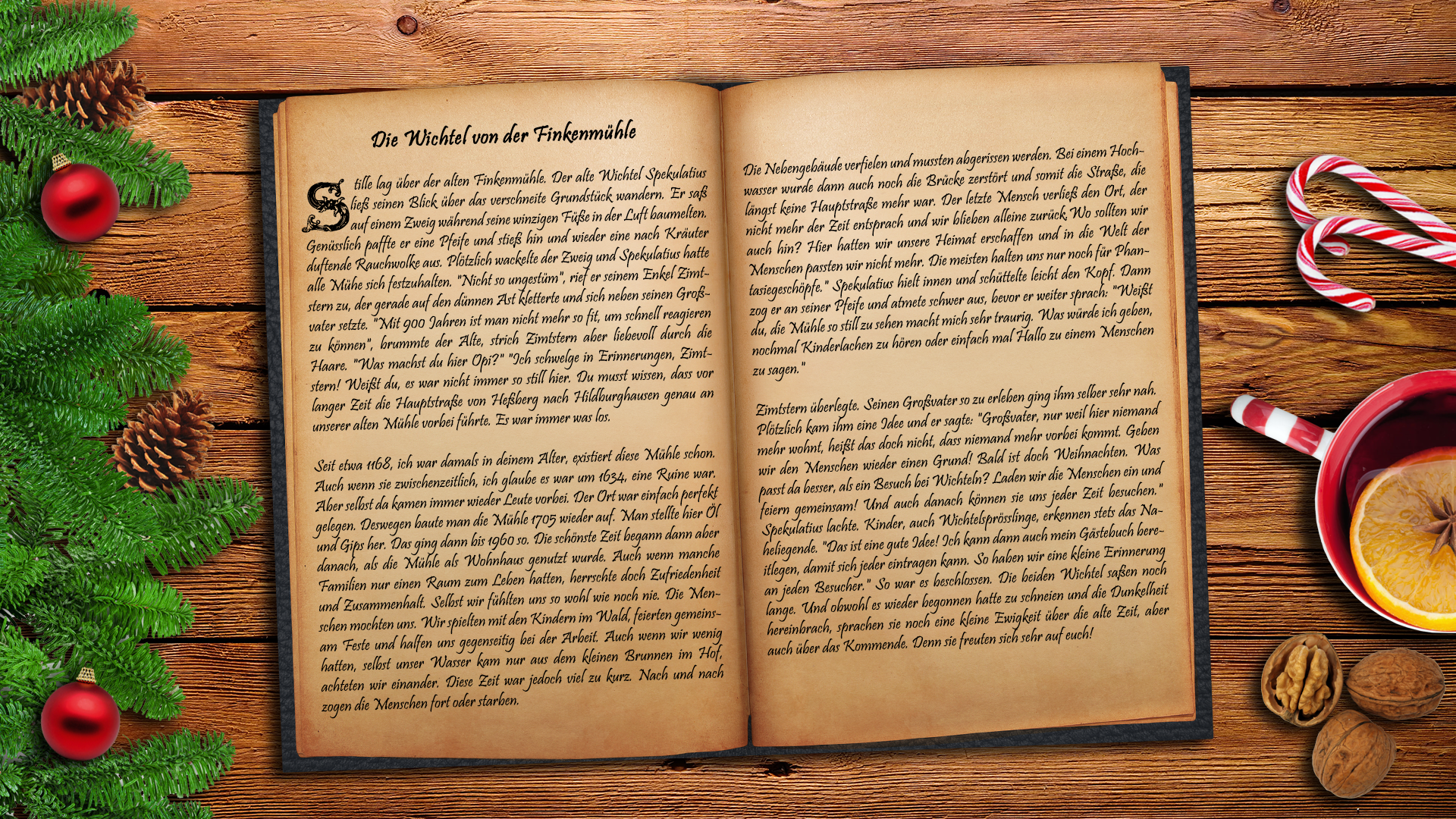 Stille lag über der alten Finkenmühle. Der alte Wichtel Spekulatius ließ seinen Blick über das verschneite Grundstück wandern. Er saß auf einem Zweig während seine winzigen Füße in der Luft baumelten. Genüsslich paffte er eine Pfeife und stieß hin und wieder eine nach Kräuter duftende Rauchwolke aus. Plötzlich wackelte der Zweig und Spekulatius hatte alle Mühe sich festzuhalten. "Nicht so ungestüm", rief er seinem Enkel Zimtstern zu, der gerade auf den dünnen Ast kletterte und sich neben seinen Großvater setzte. "Mit 900 Jahren ist man nicht mehr so fit, um schnell reagieren zu können", brummte der Alte, strich Zimtstern aber liebevoll durch die Haare. "Was machst du hier Opi?" "Ich schwelge in Erinnerungen, Zimtstern! Weißt du, es war nicht immer so still hier. Du musst wissen, dass vor langer Zeit die Hauptstraße von Heßberg nach Hildburghausen genau an unserer alten Mühle vorbei führte. Es war immer was los.