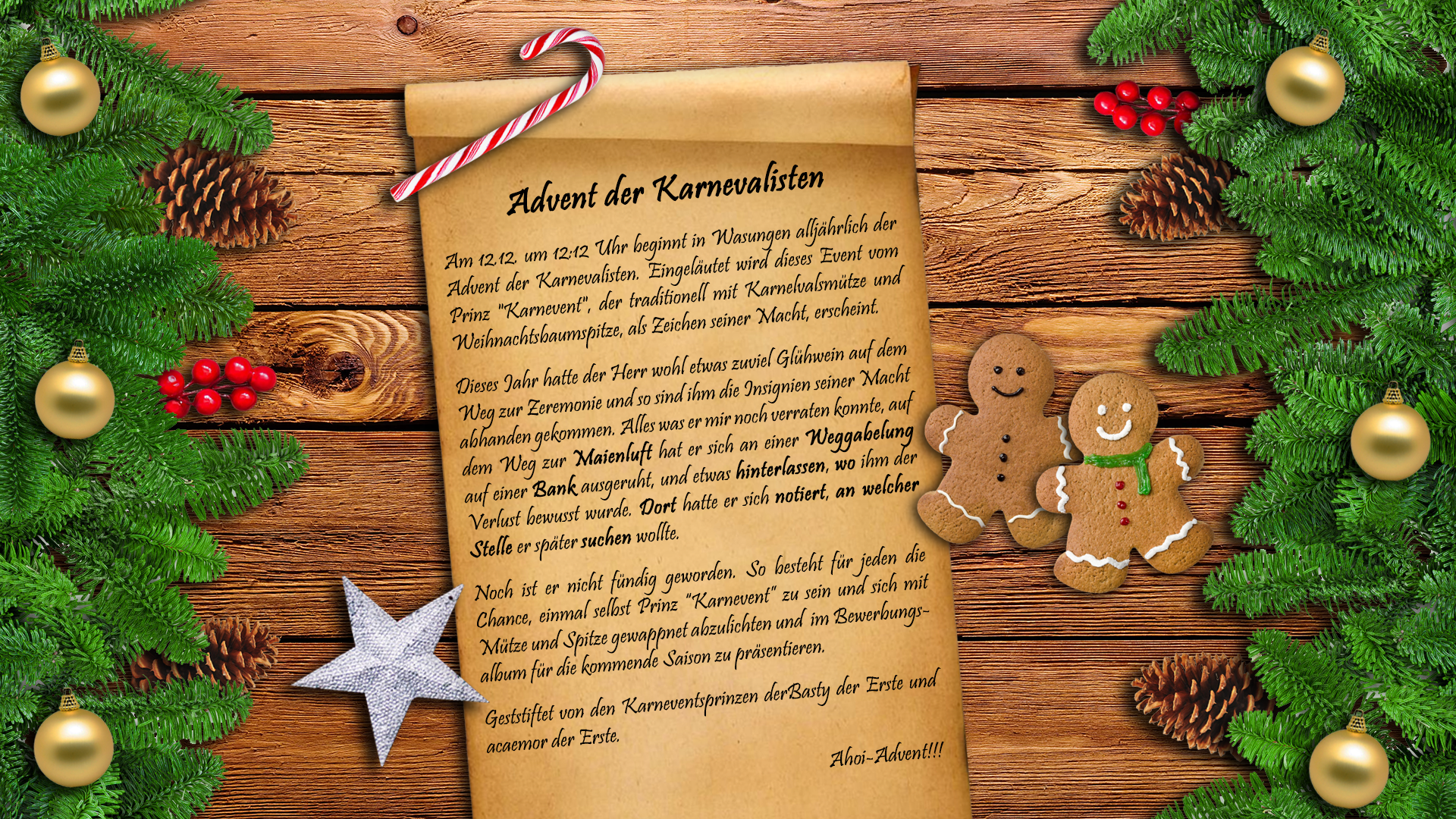 Am 12.12. um 12:12 Uhr beginnt in Wasungen alljährlich der Advent der Karnevalisten. Eingeläutet wird dieses Event vom Prinz "Karnevent", der traditionell mit Karnelvalsmütze und Weihnachtsbaumspitze, als Zeichen seiner Macht, erscheint.