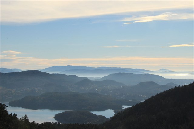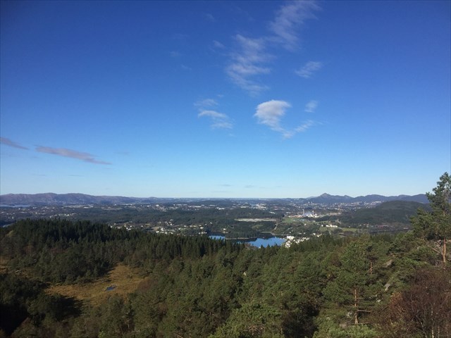 Over: Utsyn mot sør. Nærast ser du Lysefjorden med Lysøyo, lenger bak kan du sjå mot Fitjar.