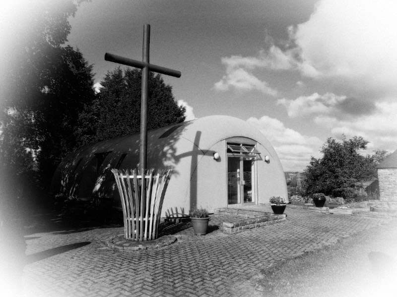 The unusual design was chosen to withstand strong winds which buffet this this ridge and to cope with mining subsidence that the area suffers. It was consecrated in 1886. It is a small building, with low maintenance costs, built from fibreglass and is strong enough to withstand the harshest climate.