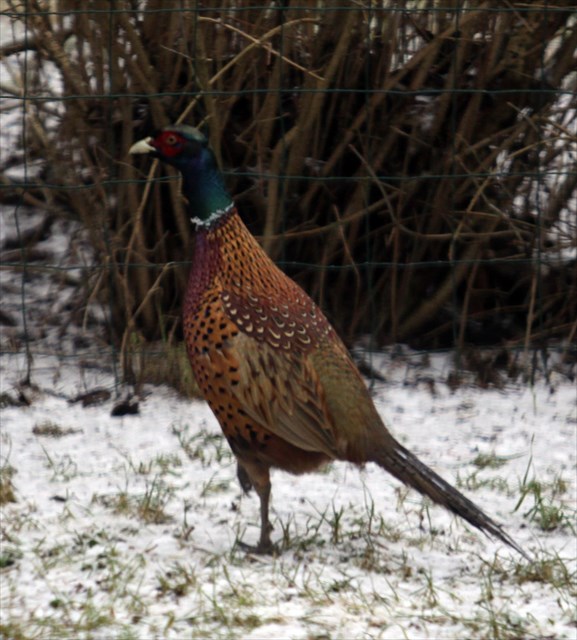 Kuvan fasaani valitsi kissan ja koirien väliltä koira-aitauksen turvallisemmaksi.