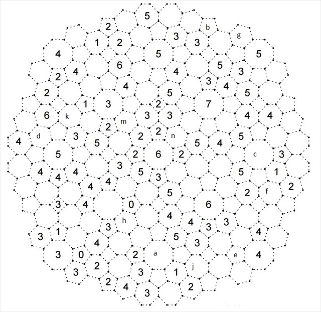 - Locate the letters a through to n in the puzzle (i and l are omitted). For each letter, its numeric value is the number of lines around the cell.