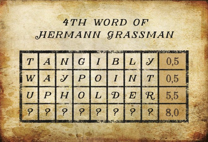 Zu erraten ist das geheimnisvolle vierte Wort von Hermann Grassmann. Das Wort muss mithilfe des obenstehenden Diagramms und unter Beachtung einiger einfacher Regeln erraten werden: