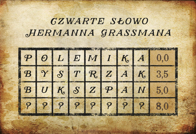 Do odgadnięcia jest tajemnicze czwarte słowo Hermanna Grassmanna. Słowo należy odgadnąć korzystając z powyższego diagramu i pamiętając o kilku prostych regułach: