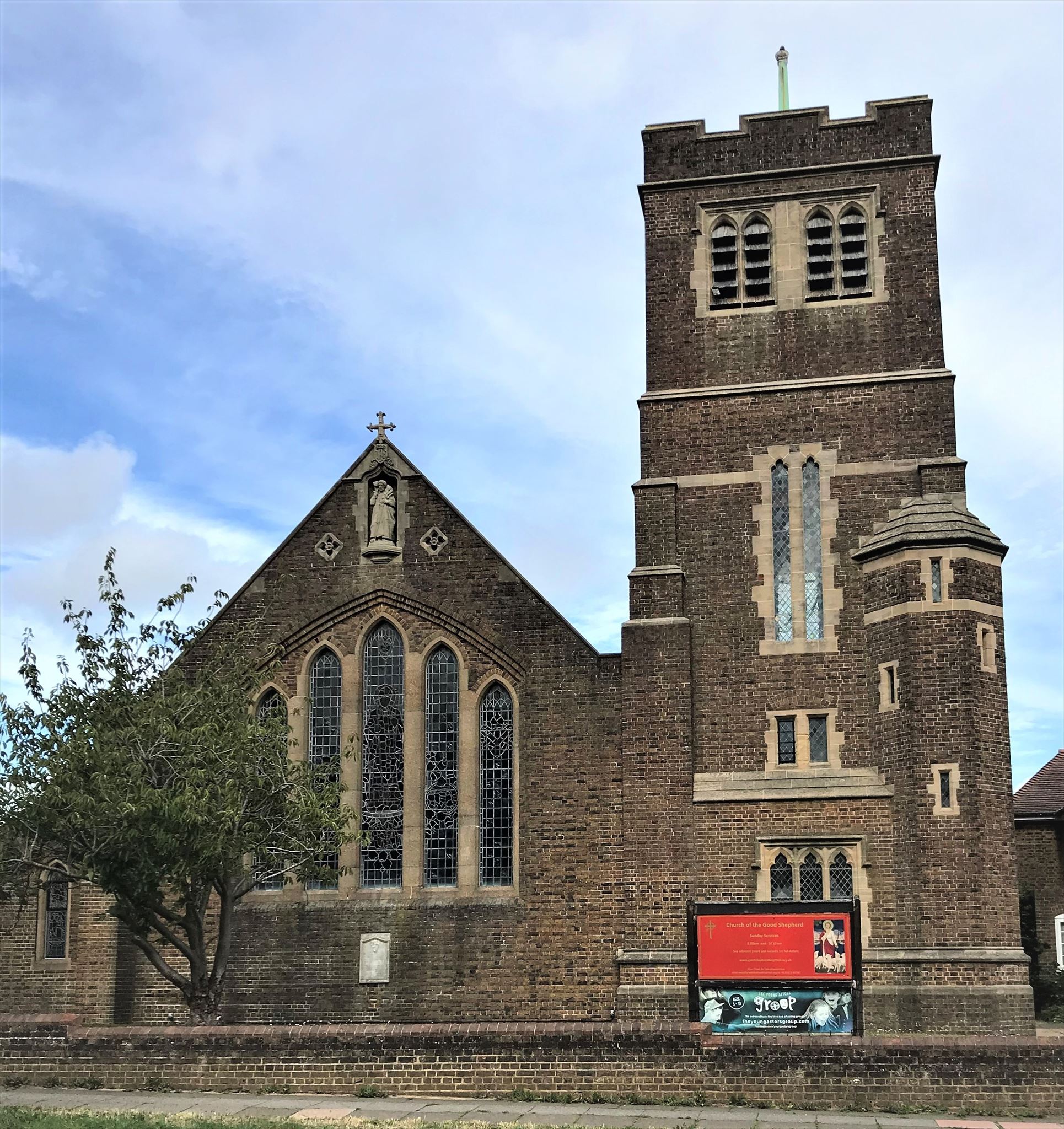 This is one of a series of Church Micros in the northern part of Brighton & Hove, leading to a Bonus. In order to complete the Bonus cache, you will need to collect clues at each of the locations. These are not in the caches themselves, but in or near the grounds of these places of worship. The Church of the Good Shepherd was built between 1921 and 1922, as a memorial to a former Vicar of the parish of Preston. Edward Warren used variegated bricks and a simple Gothic style for this Anglican church.