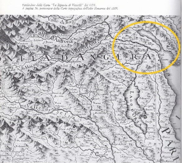 Walking through the village of Fondotoce you can immediately notice that the older buildings are located at the foot of the hill, whereas the more recent ones can be found in the plain area: this straightaway suggests that the plain is a territory of more recent geological formation which was once not long ago flooded by the waters of Lake Maggiore. Formerly the Borromean Gulf was in fact far wider than it is now and it also featured two inlets which were separated by Montorfano: one is represented by the present-day Lake of Mergozzo and the other almost reached out to Gravellona (Image 1). On the basis of a number of sources it can be assumed that the formation of the Fondotoce plain and the subsequent detachment of the Lake of Mergozzo from Lake Maggiore (begun during the XIIIth century) eventually reached completion between the XIVth and XVth centuries. This whole process was carried out by the continuous deposit of alluvial detrital material washed out by the river Toce, “la Toce”, and by the river Strona which once both flowed into Lake Maggiore. Nowadays the lake of Mergozzo is still linked to Lake Maggiore via an artificial canal and on the plain there are now meadows, fields, poplar groves, floricultural businesses and campsites (Image 2).