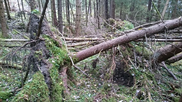 Her er en liten trollskog. Dere kan tydelig se hvor trollene har kastet fra seg trærne der de ligger hulter i bulter. Vi annbafaler å parkere ved kirken og gå Kongevegen hit, det blir en fin liten tur. Det går en vei innover mot cachen, men den er privat så vennligst respekter skiltingen.