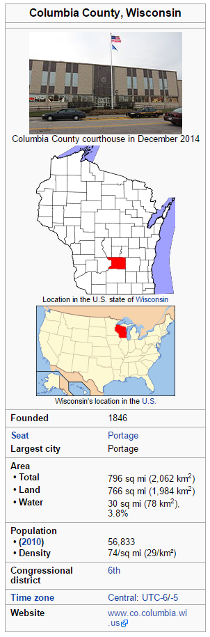 Wisconsin is made up of 72 counties, this cache is focused on Columbia County. Columbia County is a county located in the U.S. state of Wisconsin. As of the 2010 census, the population was 56,833. Its county seat and largest city is Portage. The county was created in 1846. At the time, it was in the Wisconsin Territory. Columbia County is part of the Madison, WI Metropolitan Statistical Area as well as the Madison-Janesville-Beloit, WI Combined Statistical Area. Here are a few stats about Columbia County, courtesy of Wikipedia. You can learn more about Columbia county at https://en.wikipedia.org/wiki/Columbia_County,_Wisconsin