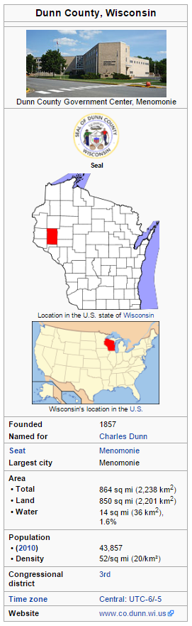 Wisconsin is made up of 72 counties, this cache is focused on Dunn County. Dunn County is a county in the U.S. state of Wisconsin. As of the 2010 census, the population was 43,857. Its county seat is Menomonie. Dunn County comprises the Menomonie, WI Micropolitan Statistical Area and is included in the Eau Claire-Menomonie, WI Combined Statistical Area. Here are a few stats about Dunn County, courtesy of Wikipedia. You can learn more about Dunn county at: https://en.wikipedia.org/wiki/Dunn_County,_Wisconsin