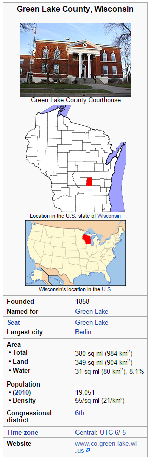 Wisconsin is made up of 72 counties, this cache is focused on Green Lake county. Green Lake County is a county located in the U.S. state of Wisconsin. As of the 2010 census, the population was 19,051. Its county seat is Green Lake. In 2010, the center of population of Wisconsin was located in Green Lake County, near the city of Markesan. Here are a few stats about Green Lake County, courtesy of Wikipedia. You can learn more about Green Lake county at: https://en.wikipedia.org/wiki/Green_Lake_County,_Wisconsin