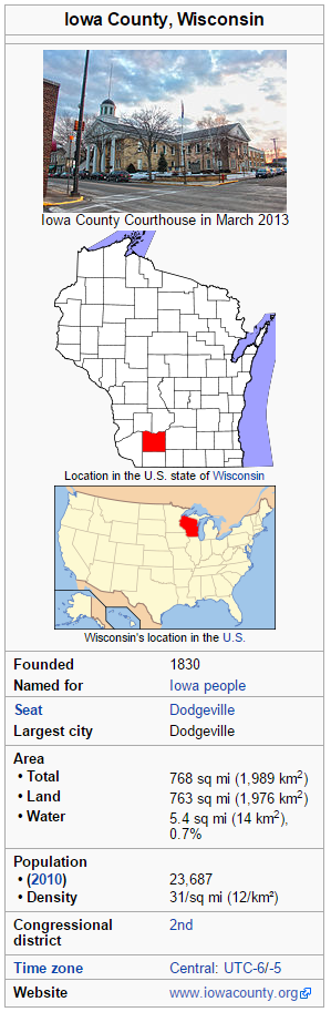 Wisconsin is made up of 72 counties, this cache is focused on Iowa county. Iowa County is a county located in the U.S. state of Wisconsin. As of the 2010 census, the population was 23,687. Its county seat and largest city is Dodgeville. When created, it was part of the Michigan Territory. Iowa County is part of the Madison, Wisconsin, Metropolitan Statistical Area. Here are a few stats about Iowa County, courtesy of Wikipedia. You can learn more about Iowa county at: https://en.wikipedia.org/wiki/Iowa_County,_Wisconsin