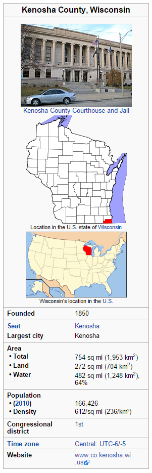 Wisconsin is made up of 72 counties, this cache is focused on Kenosha county. Kenosha County is a county located in the southeastern corner of the U.S. state of Wisconsin. As of the 2010 census, the population was 166,426. Its county seat is Kenosha. The county is named after the county seat. Kenosha County is included in the Chicago-Naperville-Elgin, IL-IN-WI Metropolitan Statistical Area. It is located on the west shore of Lake Michigan. The county has traditionally attracted newcomers from suburban Chicago, and in March 2008 the demographers of the Wisconsin Department of Administration reported that Kenosha County's improvements in roads, business's need for personnel and quality-of-life factors have contributed to a decades-long influx of Illinois transplants. Although commercial development has been greatly on the rise in the last decade, Kenosha County is very dependent on the economy of Chicago. Here are a few stats about Kenosha County, courtesy of Wikipedia. You can learn more about Kenosha county at: https://en.wikipedia.org/wiki/Kenosha_County,_Wisconsin