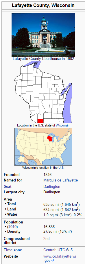 Wisconsin is made up of 72 counties, this cache is focused on Lafayette county. Lafayette County, sometimes spelled La Fayette County, is a county located in the U.S. state of Wisconsin. It was part of the Wisconsin Territory at the time of its founding. As of the 2010 census, the population was 16,836. Its county seat is Darlington. The county was named in honor of the Marquis de Lafayette, the French general who rendered assistance to the Continental Army in the American Revolutionary War. Here are a few stats about Lafayette County, courtesy of Wikipedia. You can learn more about Lafayette county at: https://en.wikipedia.org/wiki/Lafayette_County,_Wisconsin