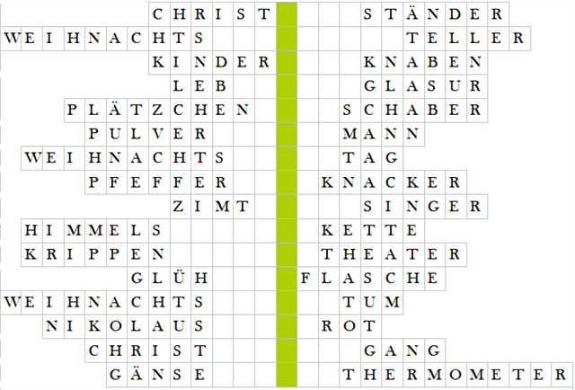 ABEND, BAUM, BRATEN, BRAUCH, CHOR, FEIER, FIGUREN, KUCHEN, LICHTER, NUSS, PLÄTZCHEN, SCHNEE, STERN, STOLLEN, TEIG, WEIN