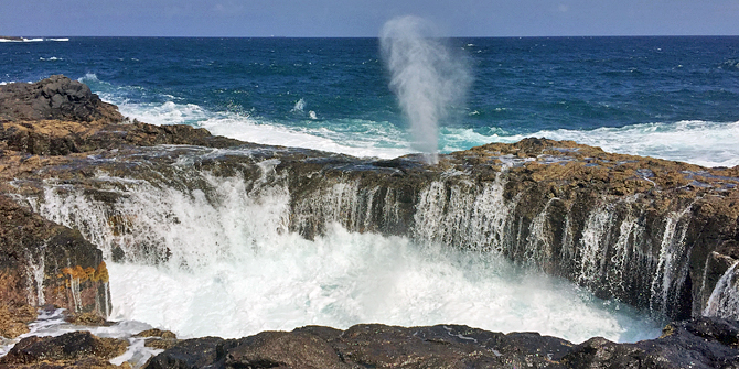 A blowhole is a geological formation which can often be found along fault lines at rugged coasts on volcanic islands with lava or eroded caves in the rocks. In the ceiling of these sea caves there has to be a narrow, chimney-like, natural cavity, that, like a skylight, reaches outside. When the waves surge into this cave at high tide, it can lead to spectacular water fountains, depending on the geometry of the cave including the chimney’s position in it and the right weather conditions. When the compressed air together with foam or the seawater itself escapes through the hole in the ceiling you might hear the characteristic snorting, that in Spanish is called bufar, what led to the name of this spectacle of nature, Bufadero.